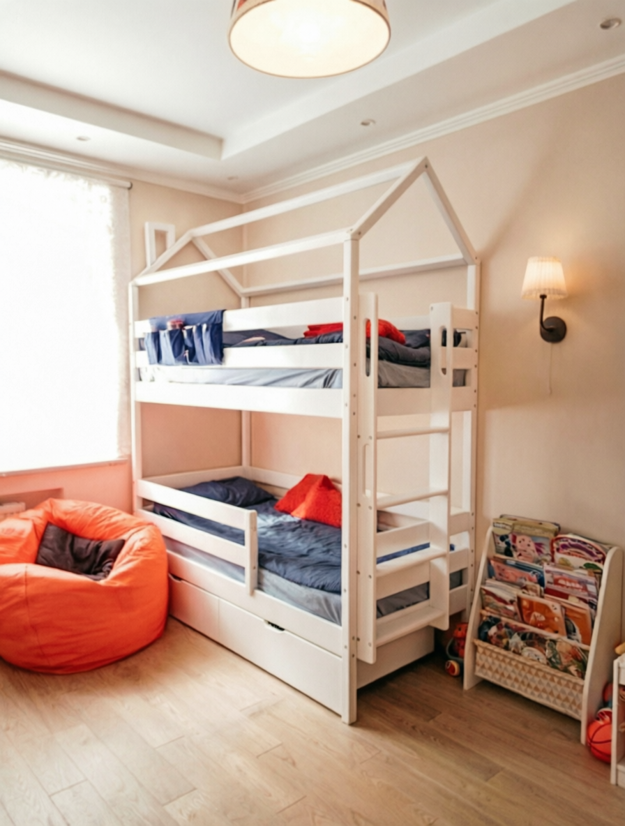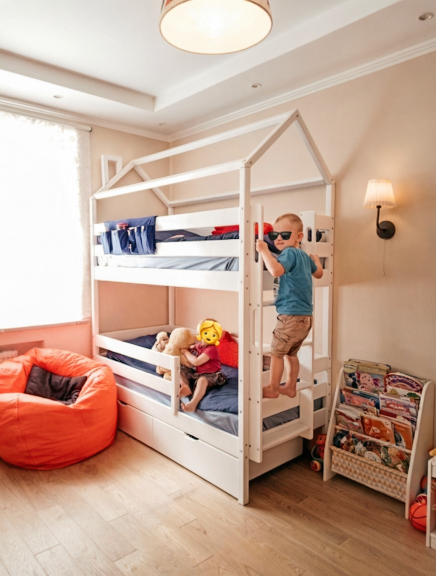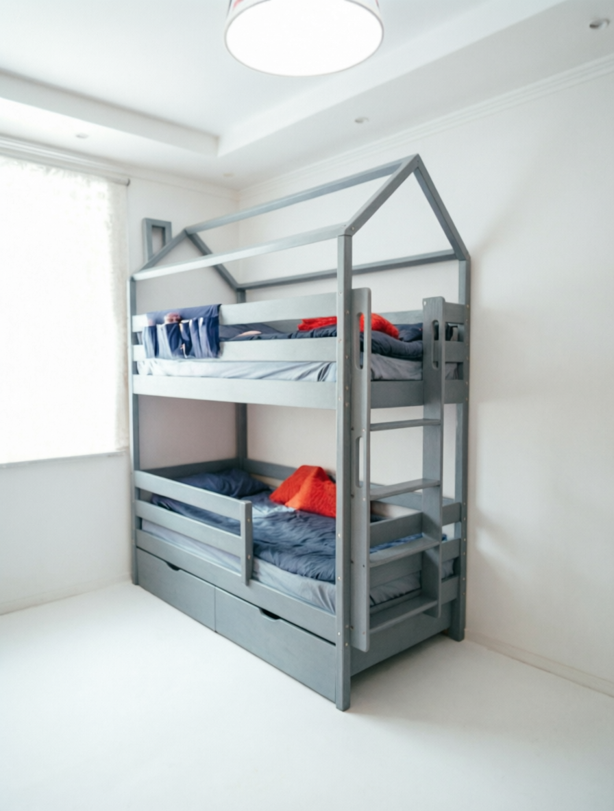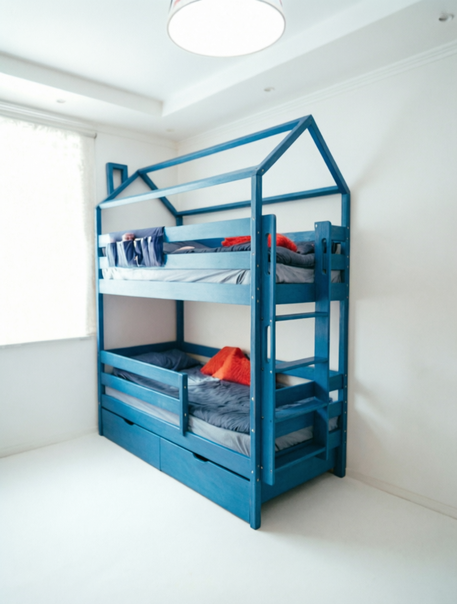 Бортик на первом ярусе входит в стоимость кровати, его можно установить как справа так и слева. Лестница с прорезями для рук сделана для удобства обхвата, когда ребенок забирается на второй ярус. Ее также можно установить как справа так и слева. Высота в коньке 230см. Бортики 37-38 см. Между ярусами 100см.