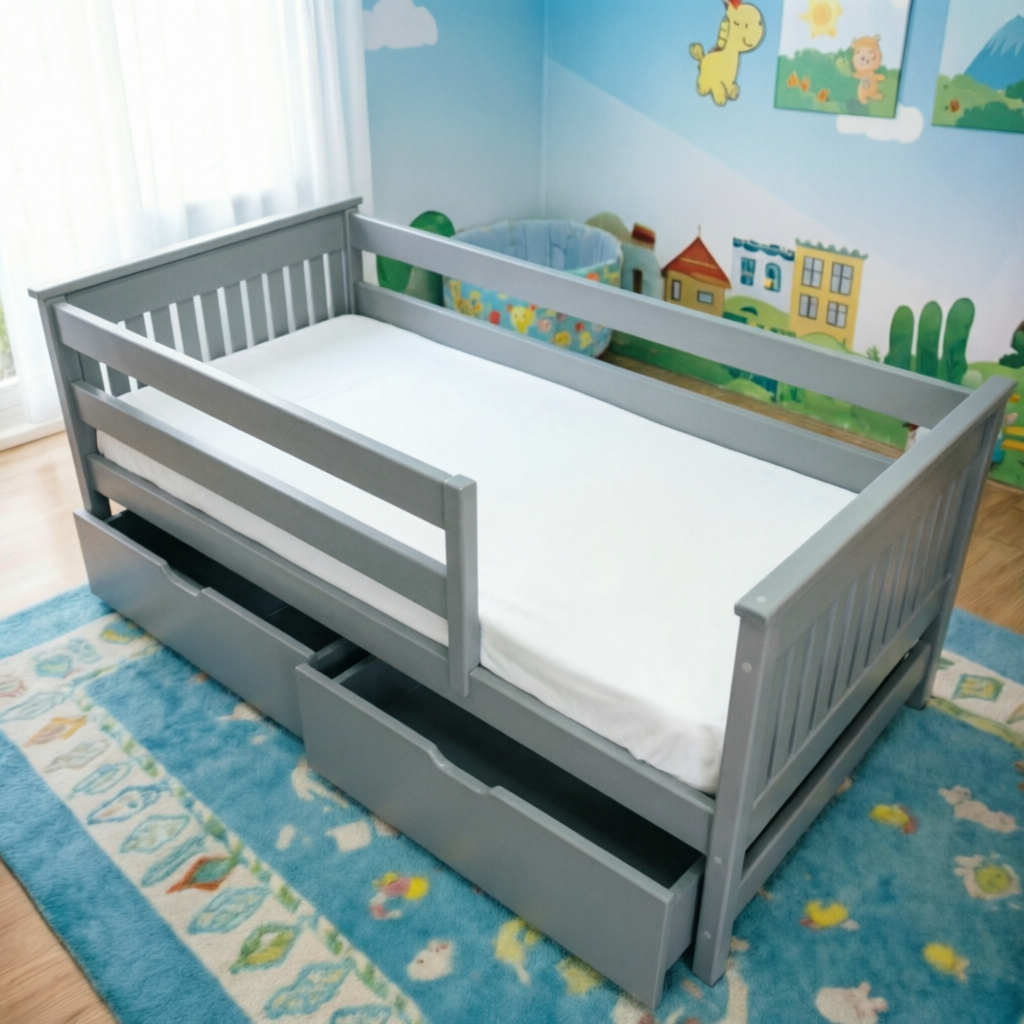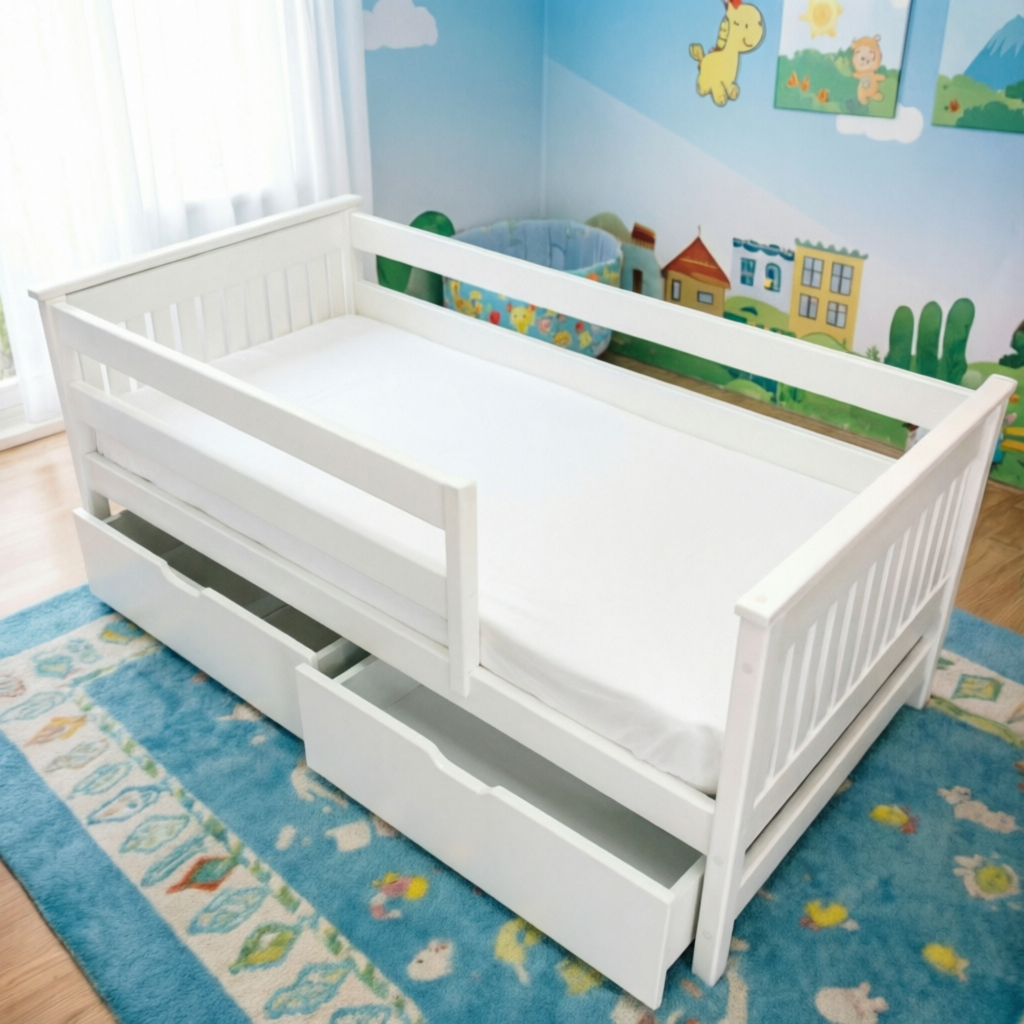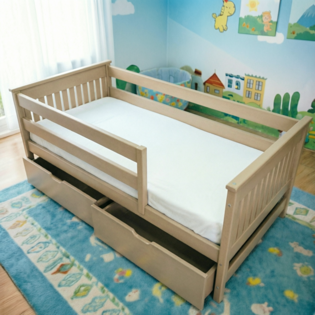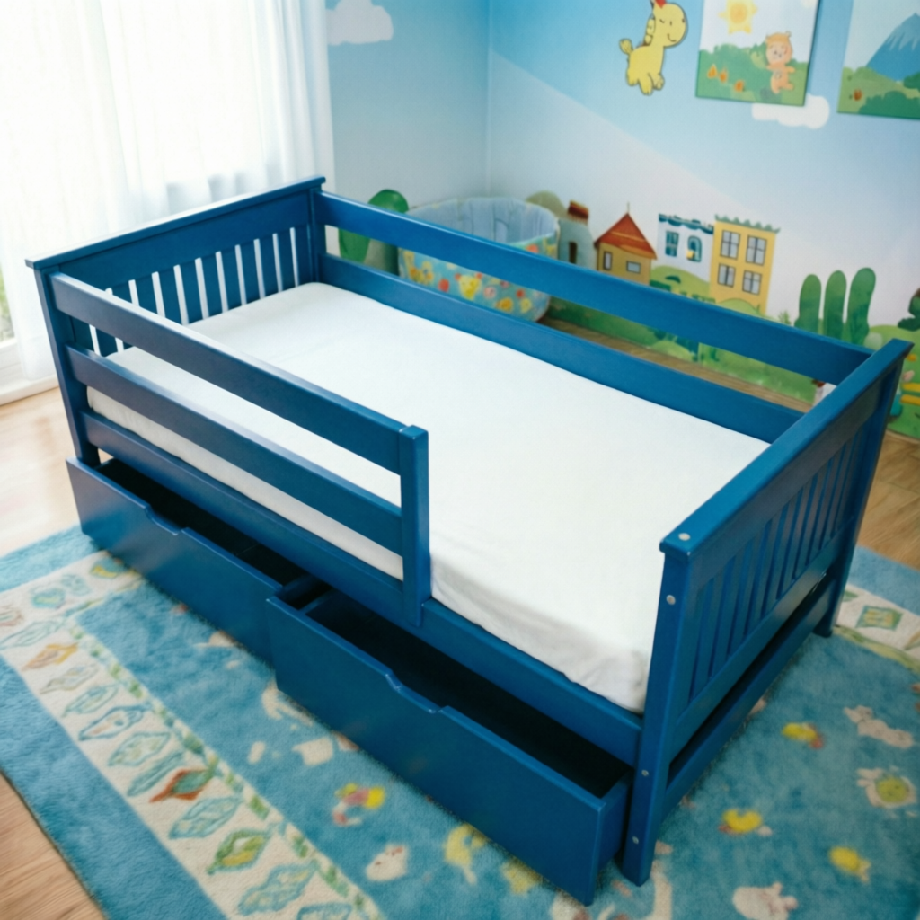 В комплекте передний бортик. Универсальный бортик — можно установить с любой стороны или снять и отверстия заклеить заглушками. Дополнительно можно приобрести ящики под кровать или выкатное спальное место. Высота бортиков 38см.